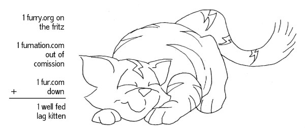 And here's a fine picture of Lagkitten voraciously pouncing a router-- you can tell Lagkitten's Lynxish origins here! Done by Caribou, whose excellent art can be seen at http://www.furnation.com/caribou